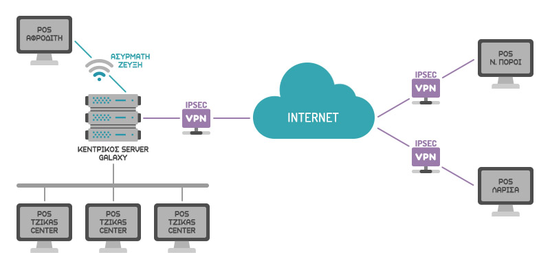 Η κεντρική εγκατάσταση του Galaxy επιλέχθηκε να γίνει στο κατάστημα "Tzikas Center" στην Ελασσόνα. Λόγω της θέσης του ήταν δυνατή η διασύνδεση μέσω κεραιών ασύρματης ζεύξης με το κατάστημα "Αφροδίτη". Η σύνδεση με τα καταστήματα της Λάρισας και των Ν. Πόρων υλοποιείται μέσω δικτύου VPN. Με αυτό τον τρόπο όλα τα καταστήματα έχουν την τελευταία πληροφορία όσον αφορά σε αποθέματα κωδικών, αξίες, εκπτώσεις κτλ. Επίσης, ο επιχειρηματίας μπορεί να έχει άμεσα την εικόνα των καταστημάτων μέσω του συστήματος reporting του Galaxy. Παράλληλα, μέσω του συστήματος Loyalty, οι πόντοι που κερδίζει ένας πελάτης μετά από κάποια αγορά μπορούν να εξαργυρωθούν σε οποιοδήποτε κατάστημα.